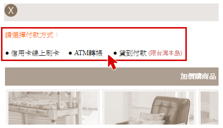 付款方式分別為 匯款/ATM轉帳、線上刷卡、貨到付款 三種選擇。